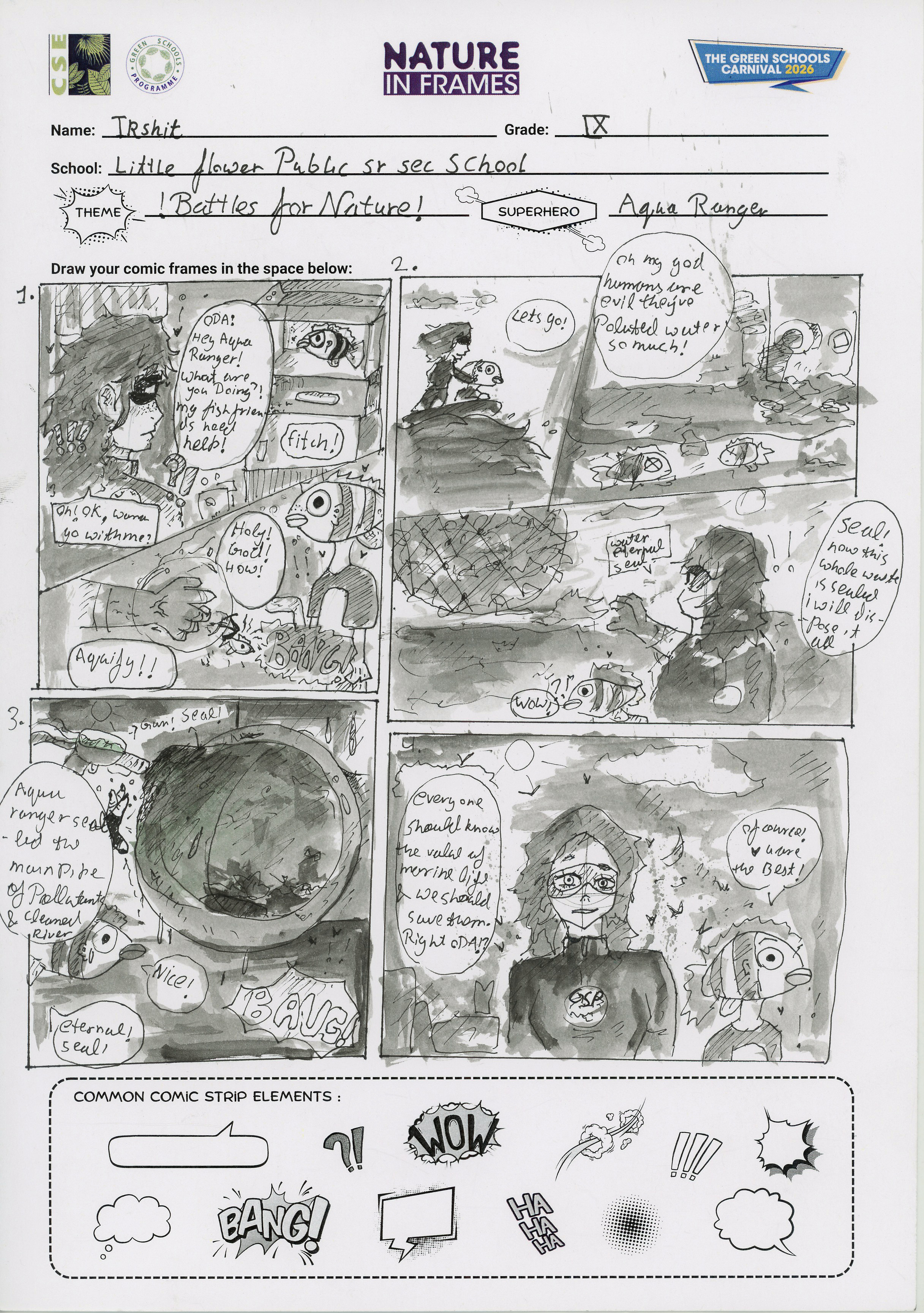 This entry won first prize in the Nature in Frames: Environmental Superhero Comic Strip Contest. The contest was conducted as part of the GSP Carnival 2026, held at the India Habitat Centre, New Delhi, on 30 January 2026.