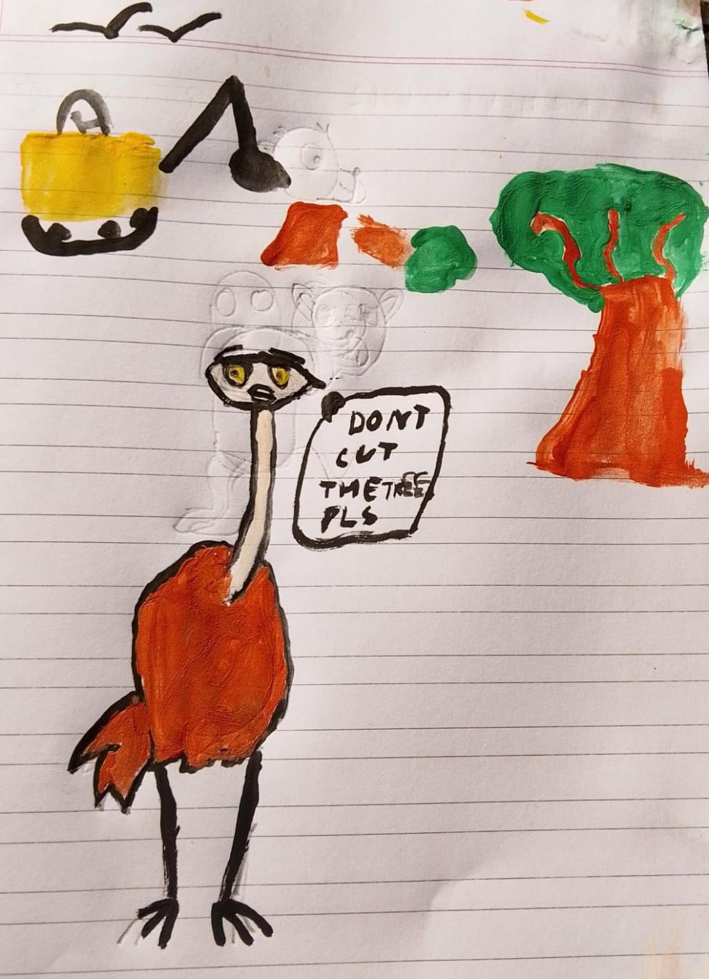 When he reached the spot, he stretched his long neck through the shrubs, and saw some humans cutting down trees. They were using humongous machines which made him tremble and become anxious.